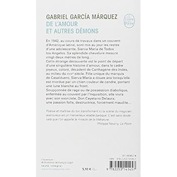 " En 1942, au cours de travaux dans un couvent d'Amérique latine, sont mis au jour les restes d'une adolescente, Sierva Maria de Todos los Angeles. Sa splendide chevelure mesure vingt-deux mètres de long...Le romancier du Général dans son labyrinthe aurait-il tiré cette étrange découverte de sa flamboyante imagination ? Réelle ou fictive, en tout cas, elle est le point de départ d'une singulière histoire d'amour, dans le cadre joyeux, coloré, décadent de Carthagène des Indes, au milieu du XVIIIe siècle.Fille unique du marquis de Casalduero, Sierva Maria a douze ans lorsqu'elle est mordue par un chien couleur de cendre, portant une lune blanche au front.Soupçonnée de rage ou de possession diabolique, enfermée au couvent par l'Inquisition, elle vivra avec son exorciste, Don Cayetano Delaura, une passion folle, destructrice, forcément maudite...Dans ce nouveau chef-d'œuvre à la croisée de l'histoire et de la légende, du mysticisme et de l'érotisme, Gabriel García Marquez recule les frontières du " réalisme magique " dont il est l'inventeur.