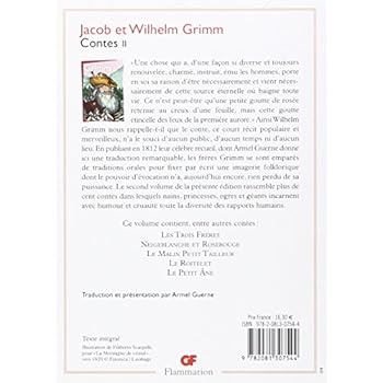 "Une chose qui a, d'une façon si diverse et toujours renouvelée, charmé, instruit, ému les hommes, porte en soi sa raison d'être nécessairement et vient nécessairement de cette source éternelle où baigne toute vie. Ce n'est peut-être qu'une petite goutte de rosée retenue au creux d'une feuille, mais cette goutte étincelle des feux de la première aurore". Ainsi Wilhelm Grimm nous rappelle-t-il que le conte, ce court récit populaire et merveilleux, n'a le souci d'aucun public, d'aucun temps ni d'aucun lieu. En publiant en 1812 leur célèbre recueil, dont Armel Guerne donne ici une traduction remarquable, les frères Grimm se sont emparés de traditions orales pour fixer par écrit une imagerie folklorique dont le pouvoir d'évocation n'a, aujourd'hui encore, rien perdu de sa puissance. Le second volume de la présente édition rassemble plus de cent contes dans lesquels nains, princesses, ogres et géants incarnent avec humour et cruauté toute la diversité des rapports humains.